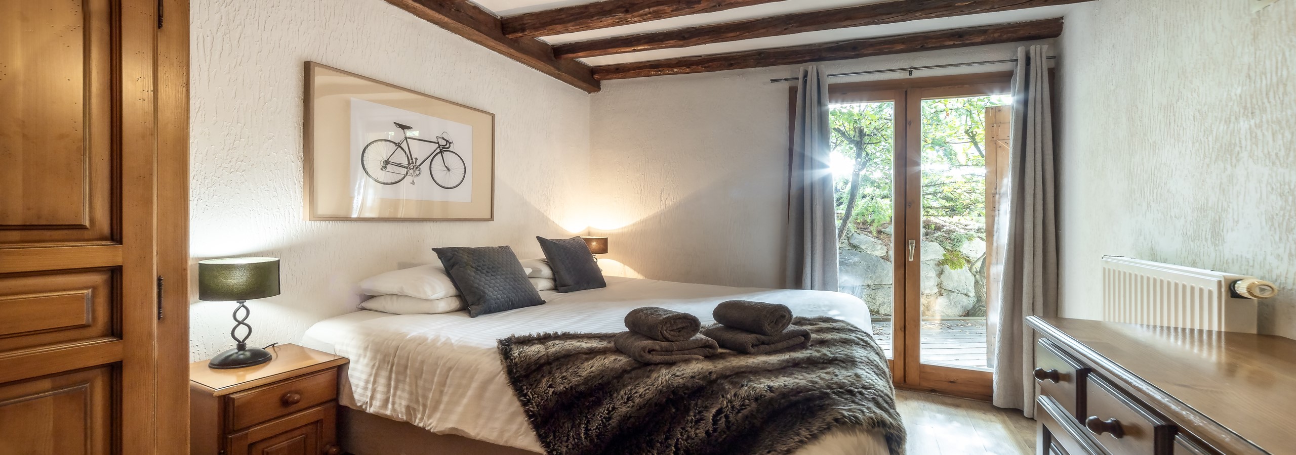 This stunning chalet has 6 en-suite bedrooms - 4x double/twin, 1x double with a single and 1 small bunk bed room. It includes a private outdoor hot tub, ski boot dryers, range of balconies and patios, BBQ, smart TV with UK and French TV channels, Wifi, open fire, underfloor heating and ski/bike storage. Located very central, with only a short stroll into town.